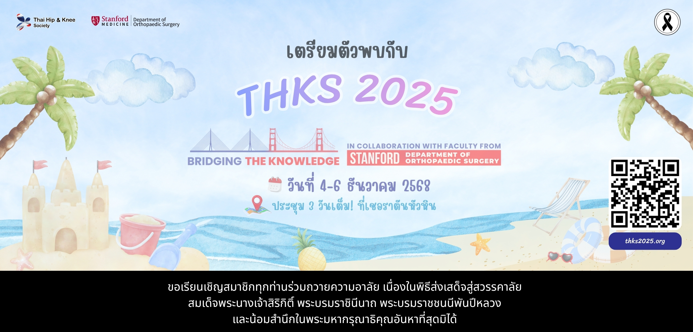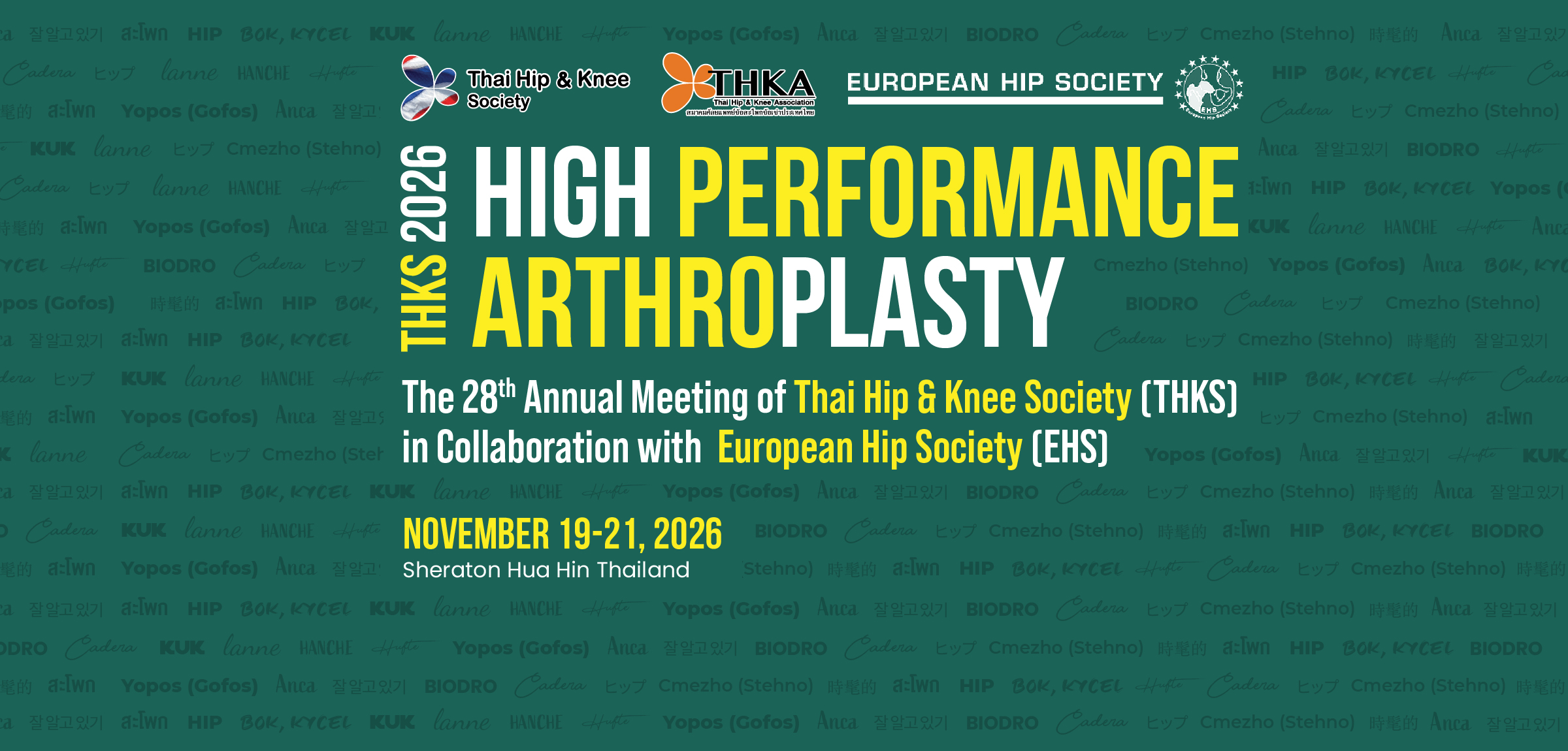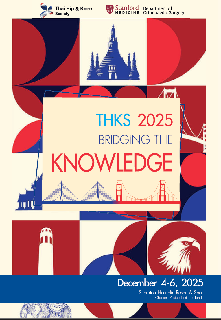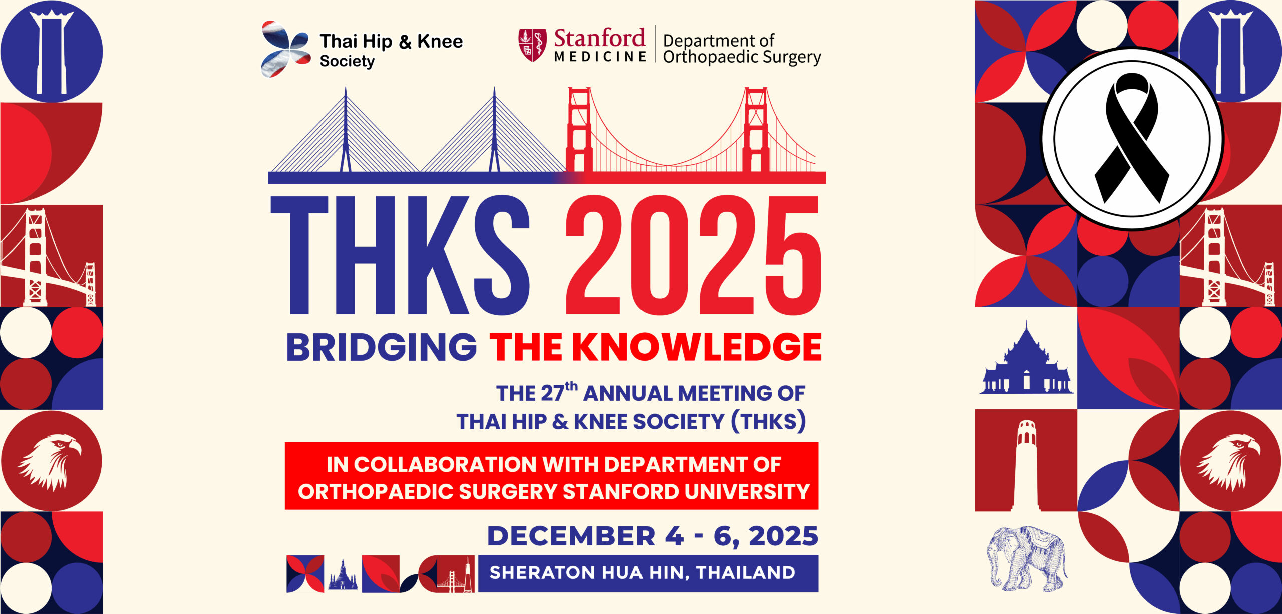 As a meeting co-chairman, I would like to call forth and invite you to the 27th annual meeting of the Thai Hip and Knee Society (THKS) which will be held in collaboration with the Stanford department of Orthopedic Surgery. The meeting will be held form December 4th-6th 2025 in Hua Hin, Thailand.
