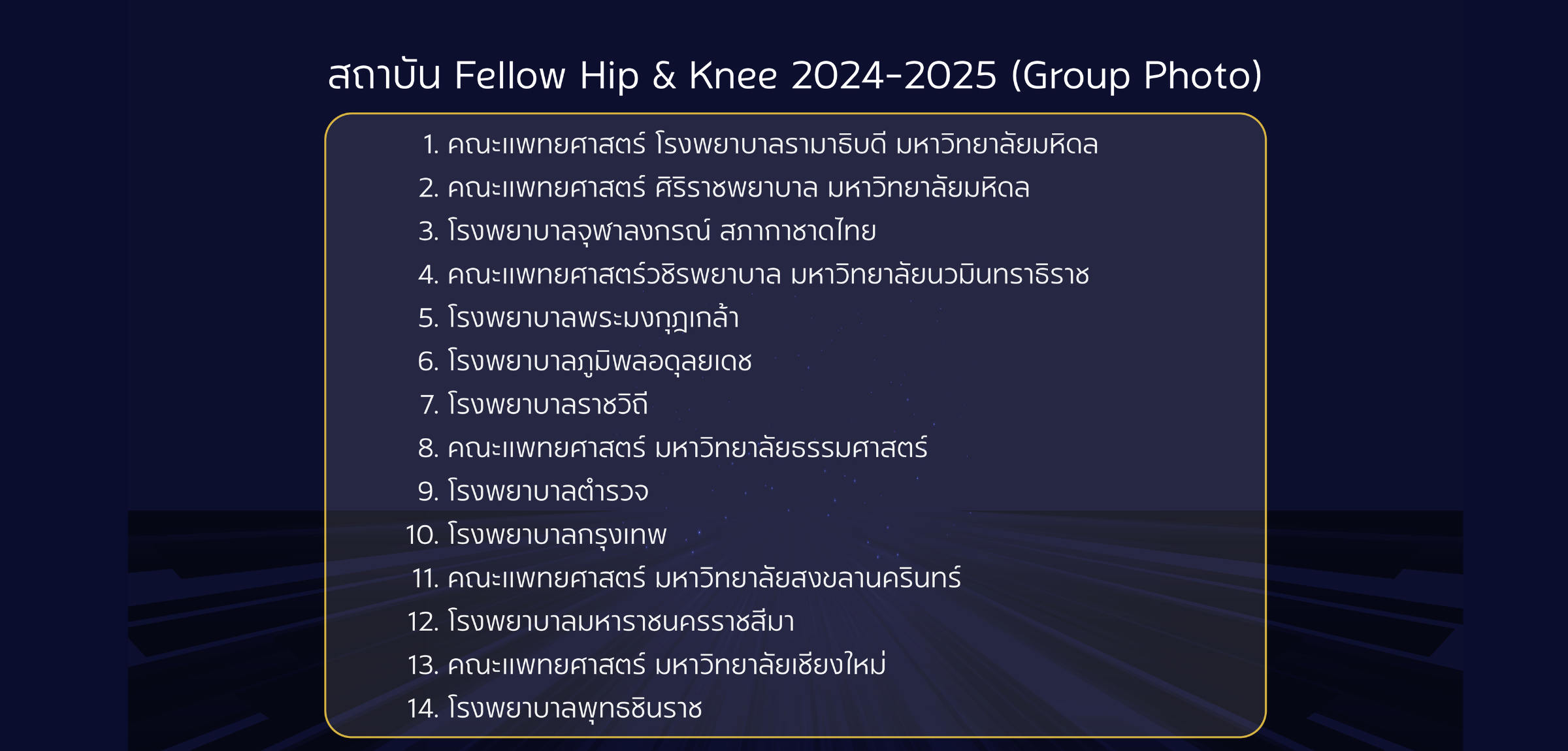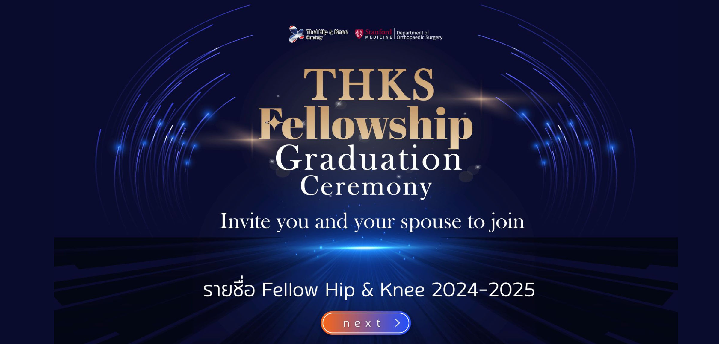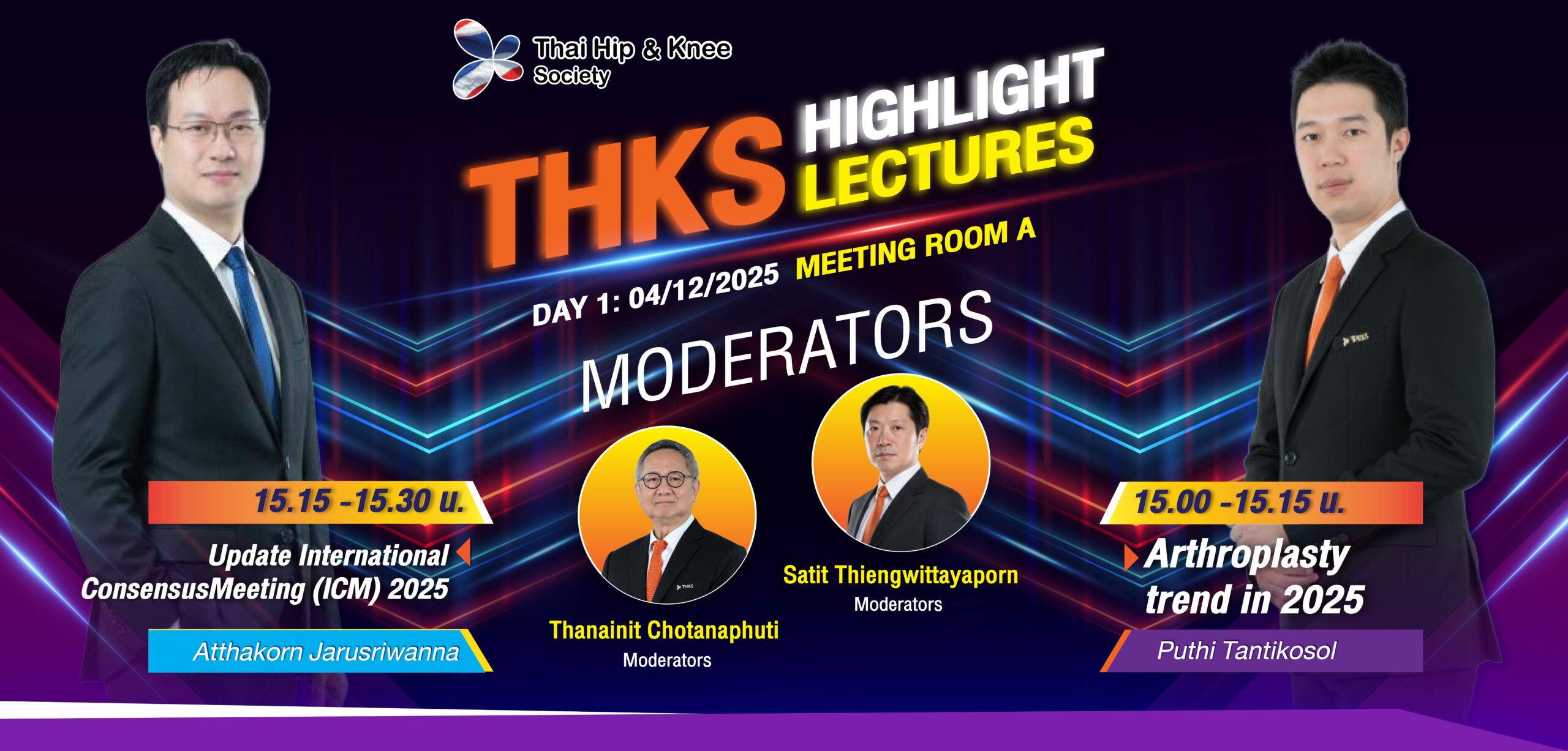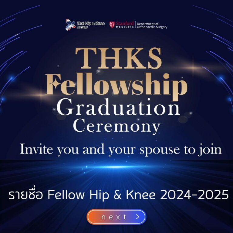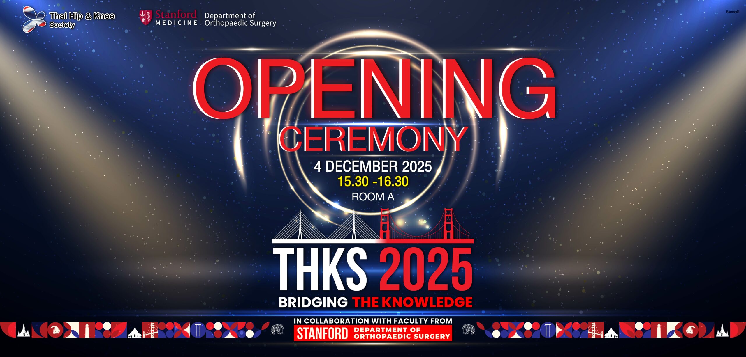 As a meeting co-chairman, I would like to call forth and invite you to the 27th annual meeting of the Thai Hip and Knee Society (THKS) which will be held in collaboration with the Stanford department of Orthopedic Surgery. The meeting will be held form December 4th-6th 2025 in Hua Hin, Thailand.